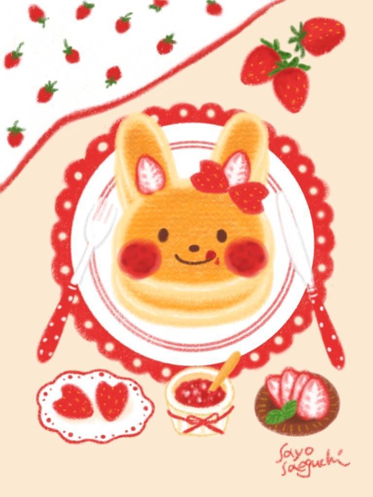 トッピングは何にする?いちごソースに、ハートのいちご。ふんわり甘〜い香りの、うさぎ型のパンケーキ。うさぎちゃんがあなたと過ごす甘い時間を待っています。