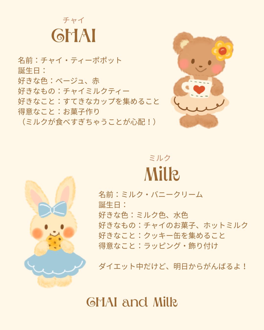 くまのぬいぐるみの女の子、チャイ。お菓子作りが大好き。いちごジャムをたっぷり使った自慢のクッキー、焼きたての一枚をどうぞ♡