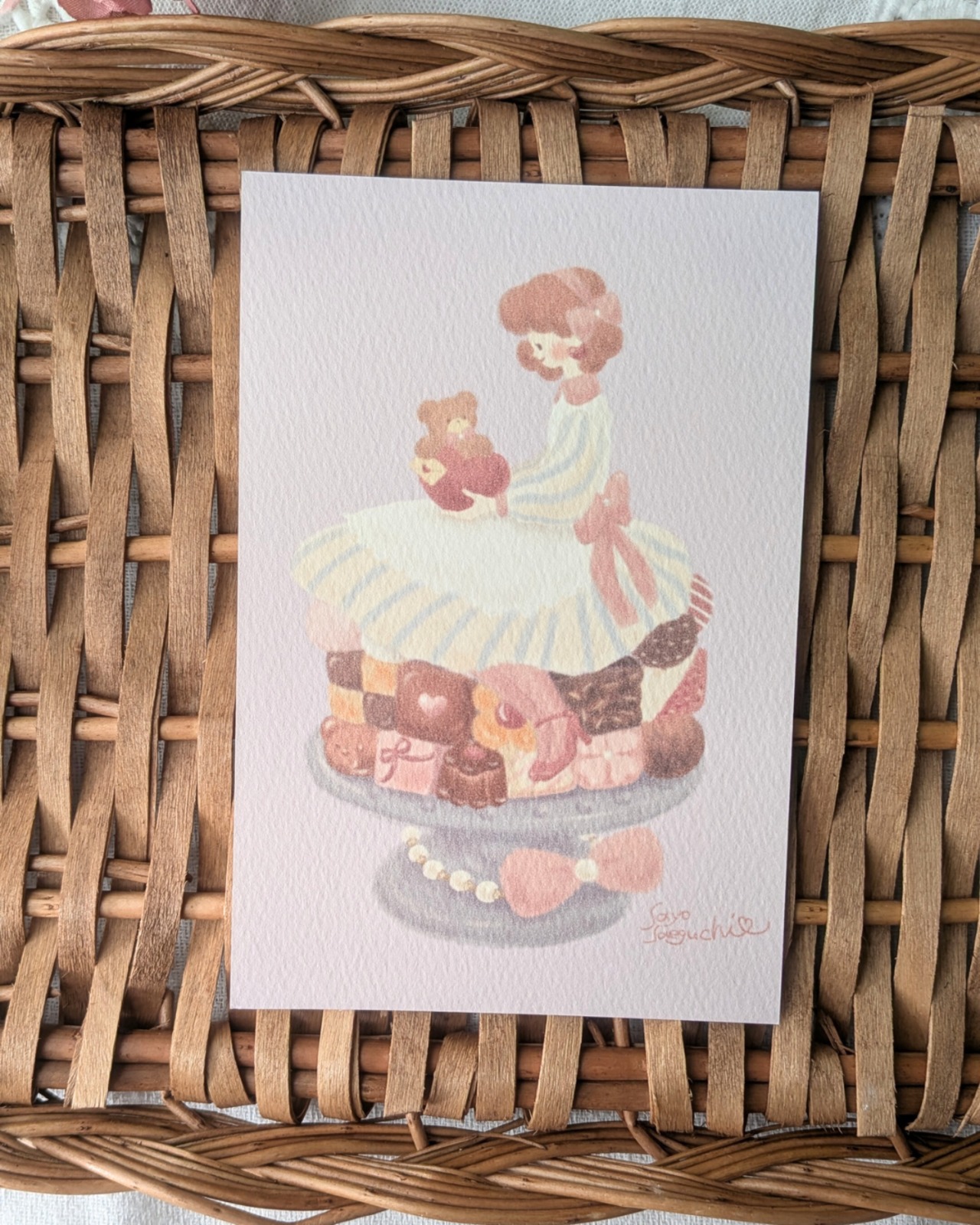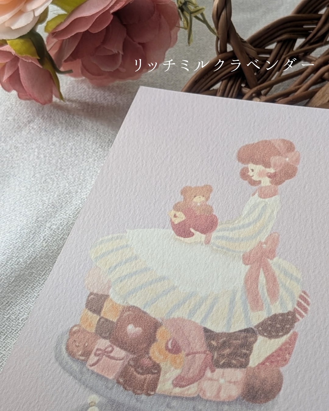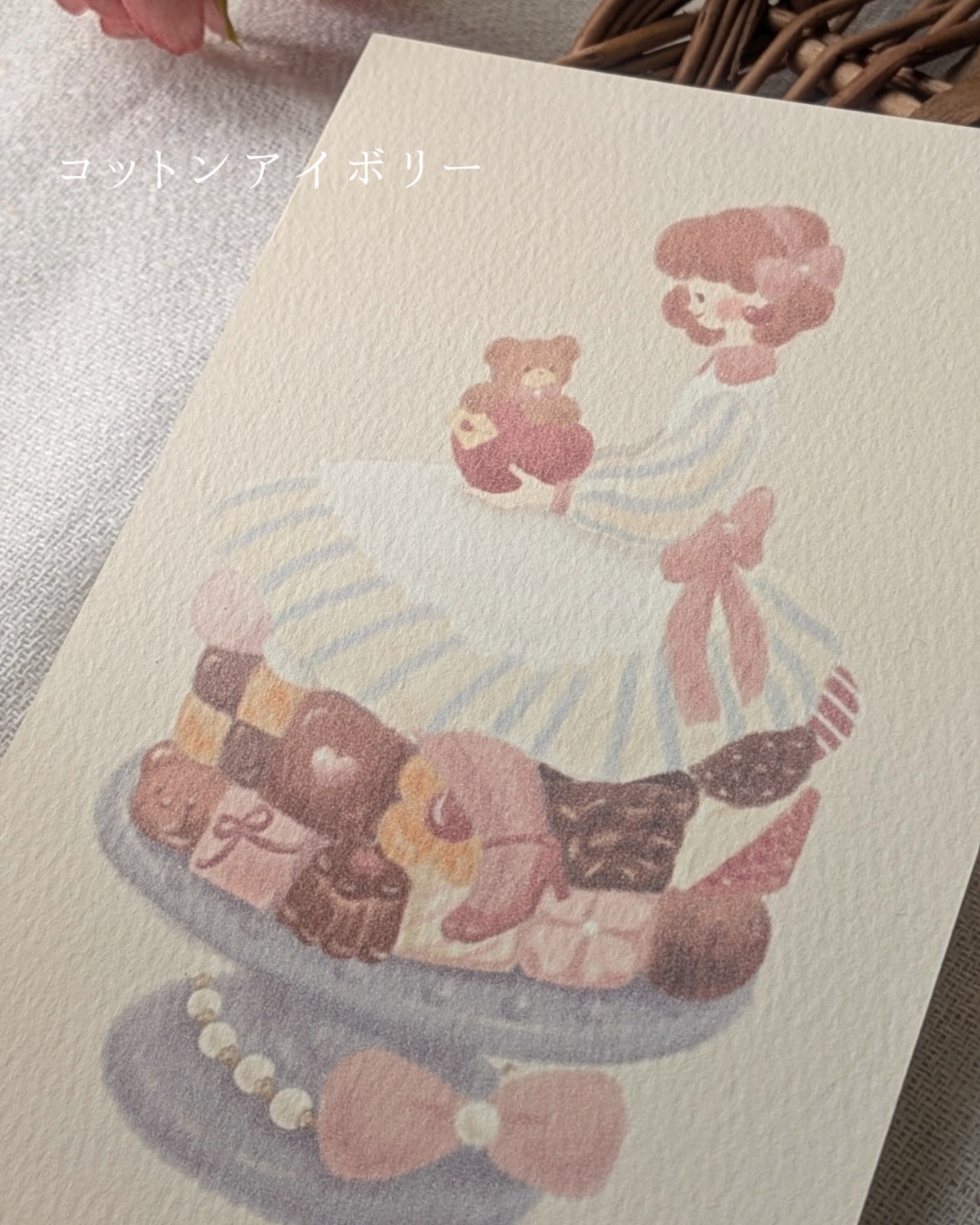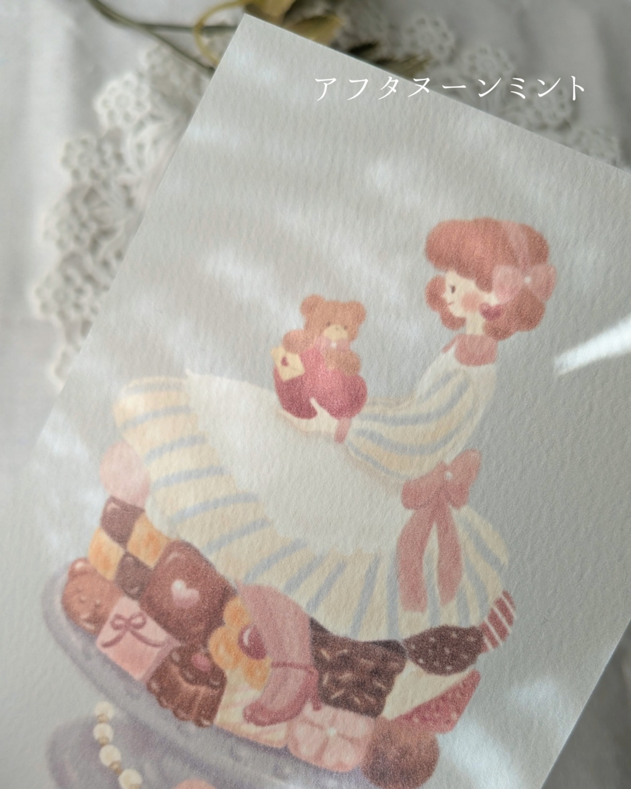 アンの膝の上にちょこんと座っているのはくまのトム。もふもふの手にはアンへのラブレター。濃厚なブラウニーやクッキー、ストロベリーチョコレート。隅々まで眺めて頂きたい一枚です。