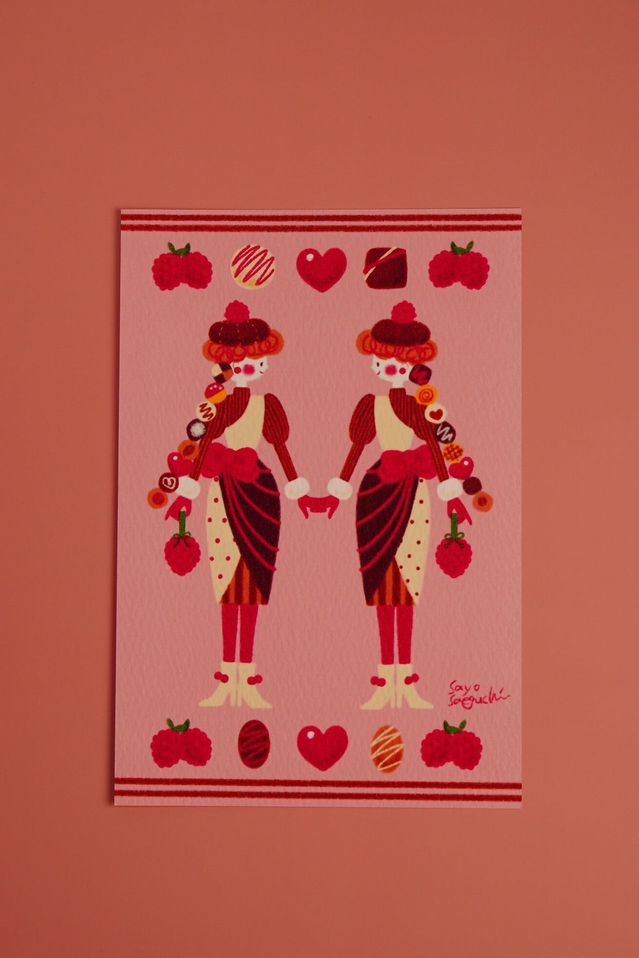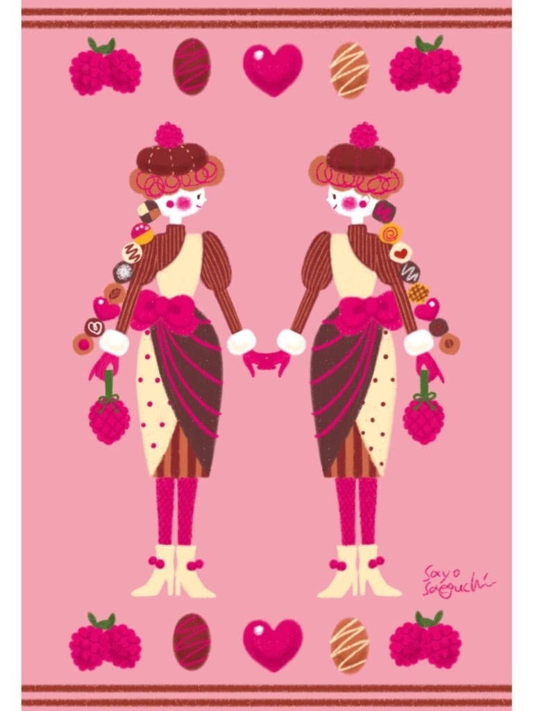 おしゃれなふたごモッカ&ラッテ。甘酸っぱいラズベリーと濃厚なショコラの組み合わせをイメージしたポップでキュートな一枚です。ホワイトチョコやラズベリーソース。ショコラのように甘いひとときに。