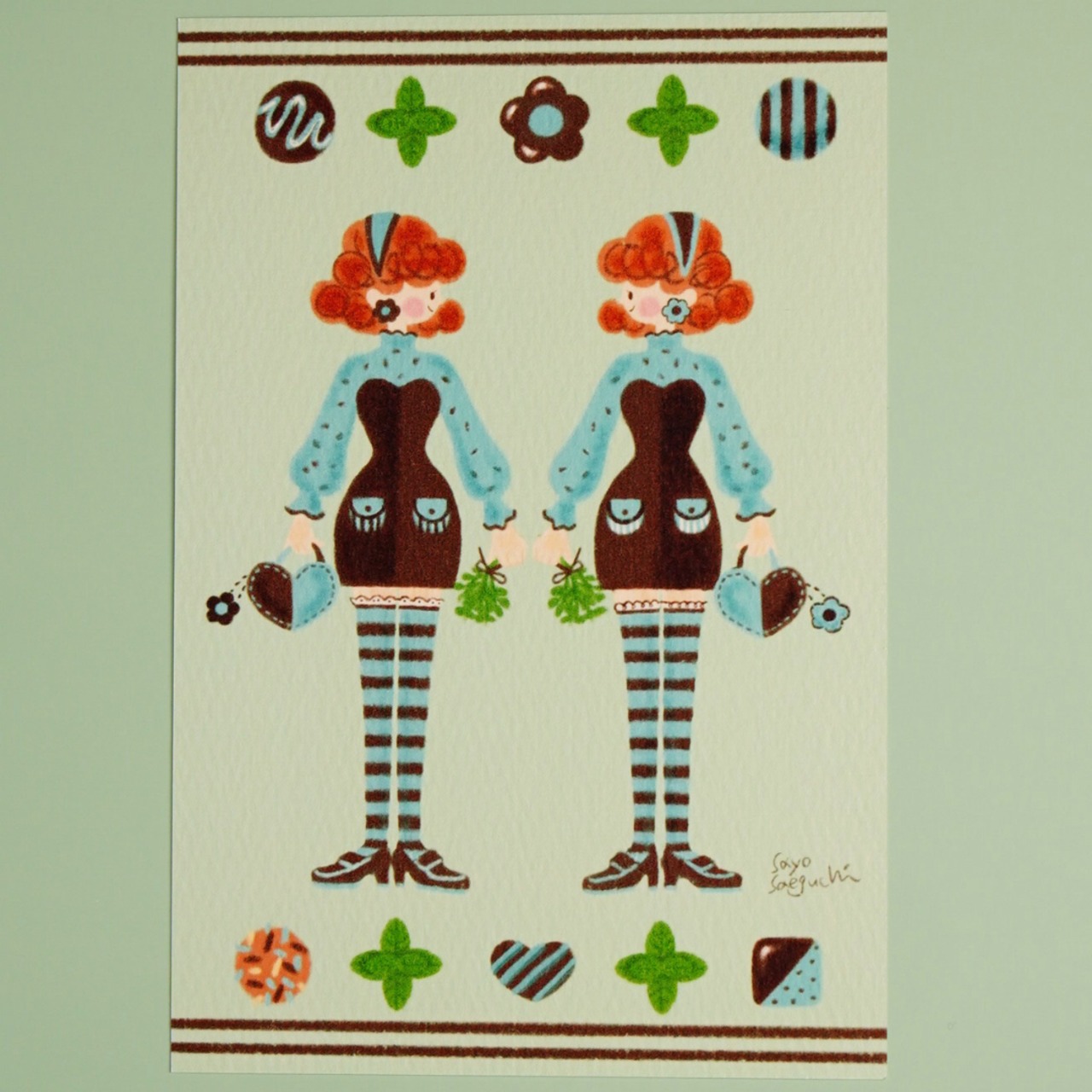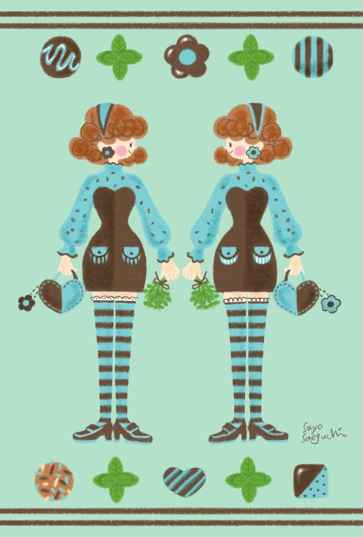 全てのチョコミン党さんへ贈るバレンタインポストカードです。ミントの爽やかさと濃厚なチョコレートコーデを楽しむモッカとラッテ。ポッケやヘアドレス、お揃いのようで実はデザインが違うところがあるんです。お部屋に飾るのはもちろん、チョコミントが大好きなあの人へどうぞ。