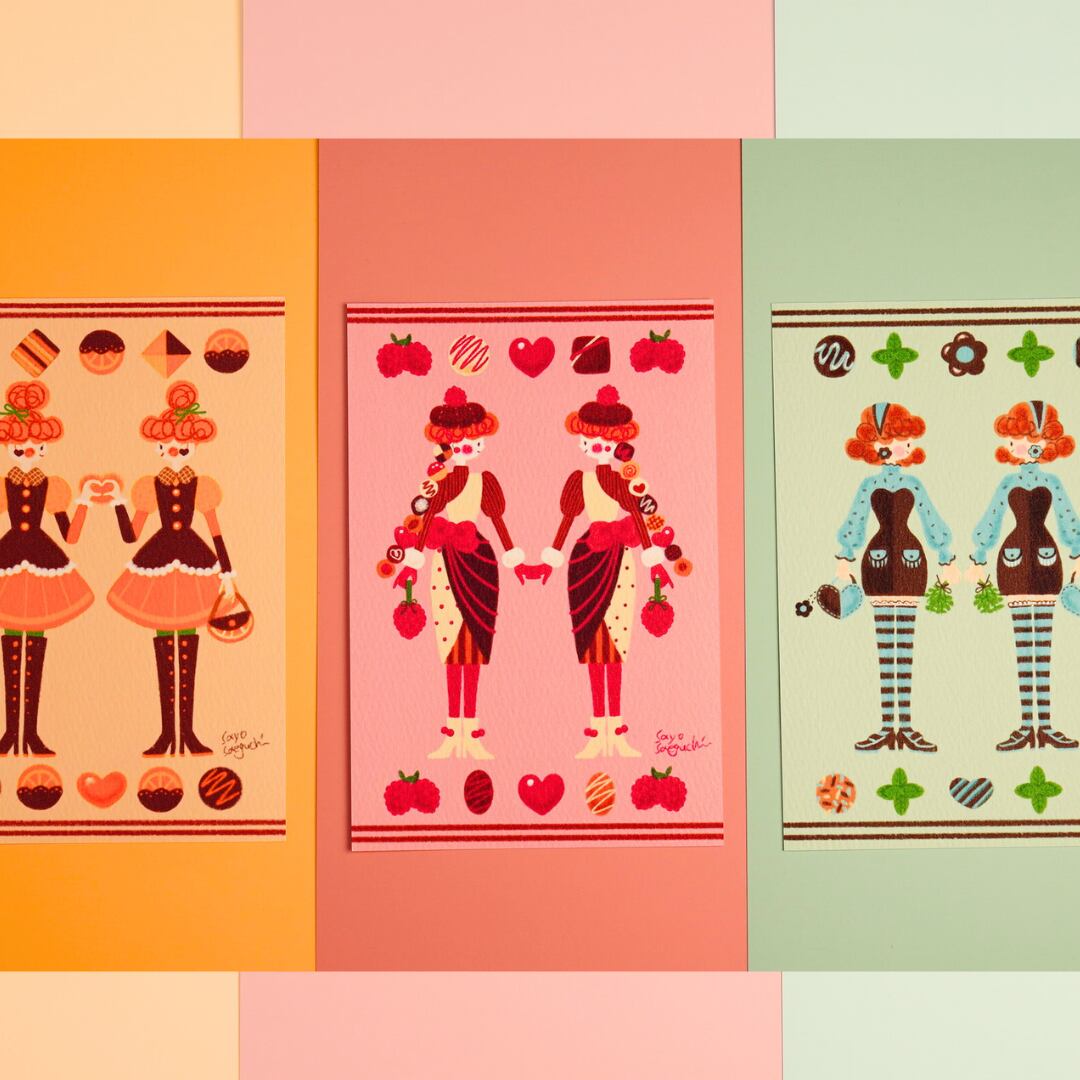 100円お得なバレンタインポストカードの3枚セットです。ラズベリー、チョコミント、オランジュショコラ。贈る相手に合わせて選ぶのも楽しいですね。気分に合わせてお部屋に飾っても。